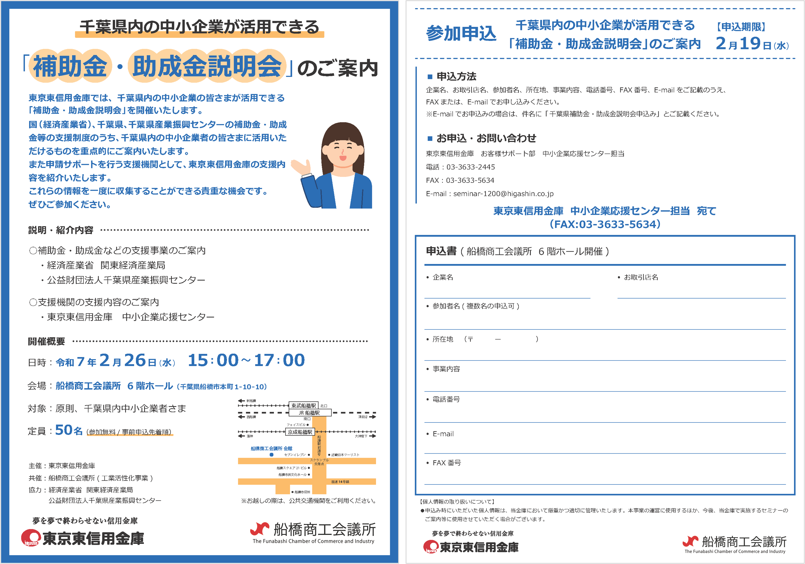 | お問い合わせ先 | 東京東信用金庫 お客様サポート部 中小企業応援センター担当 ・TEL:03-3633-2445(受付時間:平日9:00~17:00) ・FAX:03-3633-5634 ・E-mail:seminar-1200@higashin.co.jp (@は半角に置き換えてください) |